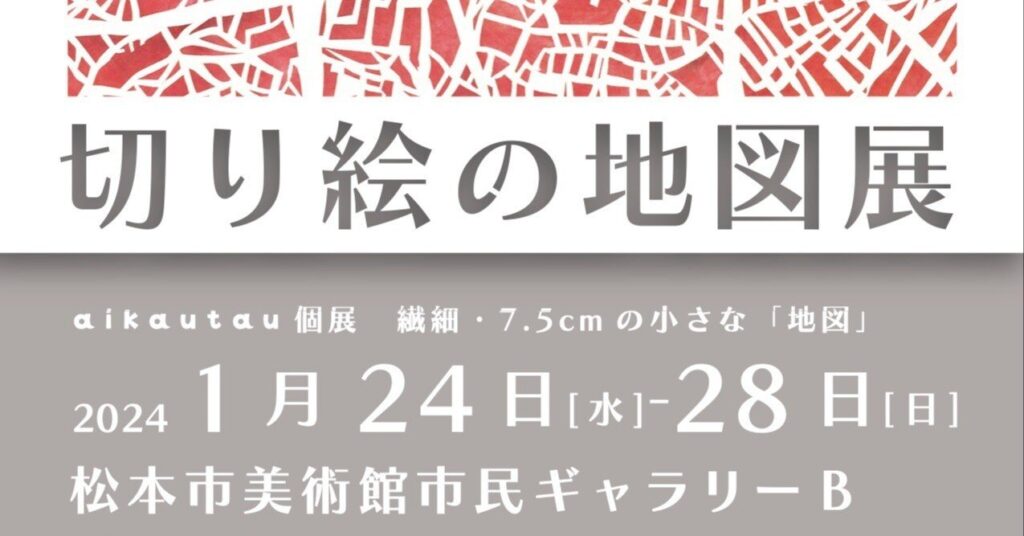 「切り絵の地図展」-aikautau 個展 繊細・7.5cm の小さな「地図」- 開催日:2024年1月24日(水)〜2024年1月28日(日) 会場:松本市美術館 市民ギャラリーB(長野県松本市中央4丁目2−22 開館時間:9時〜17時(会期中は 終日作家在廊予定) 観覧料 無料※... -