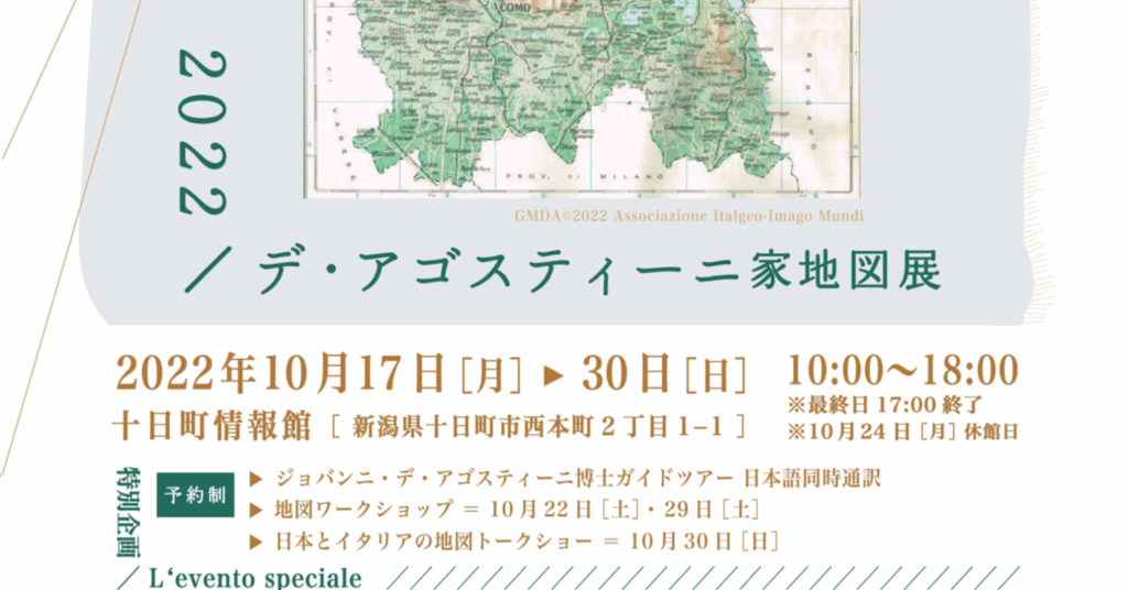 2022年11月3日(木)から11月6日(日)まで、日本地図センターにて、イタリア初の民間地図制作所で130年の歴史を持つデ・アゴスティーニ家地図展を行います。この地図展は、デ・アゴスティーニファミリーが130年をかけて作成した地図を通して、皆さまにイタリ...